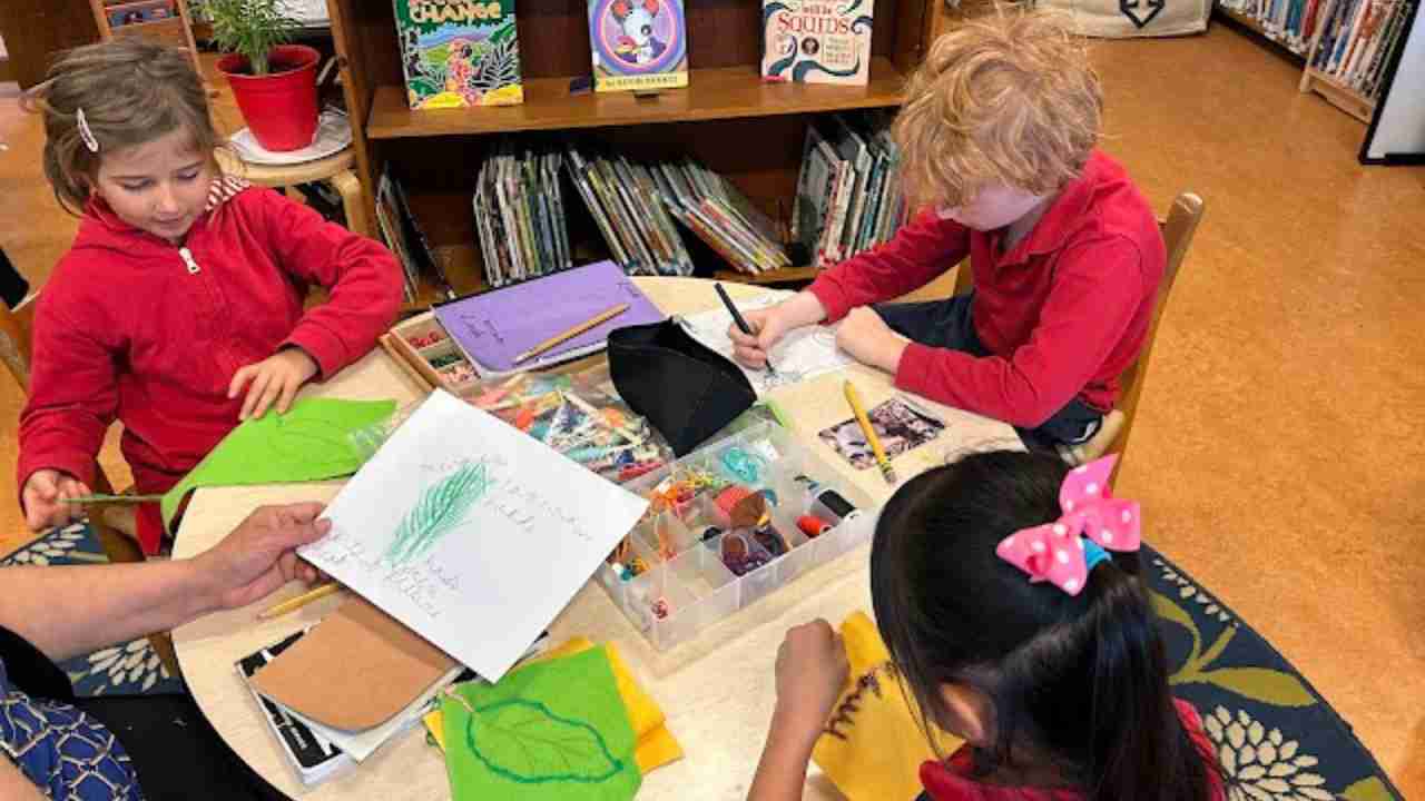 Elementary students expand their skills through weekly specialist lessons and integrated classroom projects. Art may include drawing, painting, sculpture, collage, or papier mâché that supports their academic studies. Students move from guided technique to independent creative expression. Previously introduced skills evolve into follow-up work, such as embroidering the parts of a leaf, creating papier-mâché planets, or building clay models of Earth’s layers.