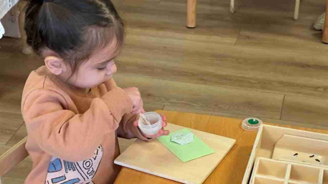 Toddlers begin to recognize art in their environment and express themselves through hands-on exploration. Real and diverse artwork is displayed at their level, and Guides share short stories about each piece to build vocabulary and appreciation for beauty. Children explore easel painting, chalk, pastels, and gluing activities that require choice, sequencing, and care.
