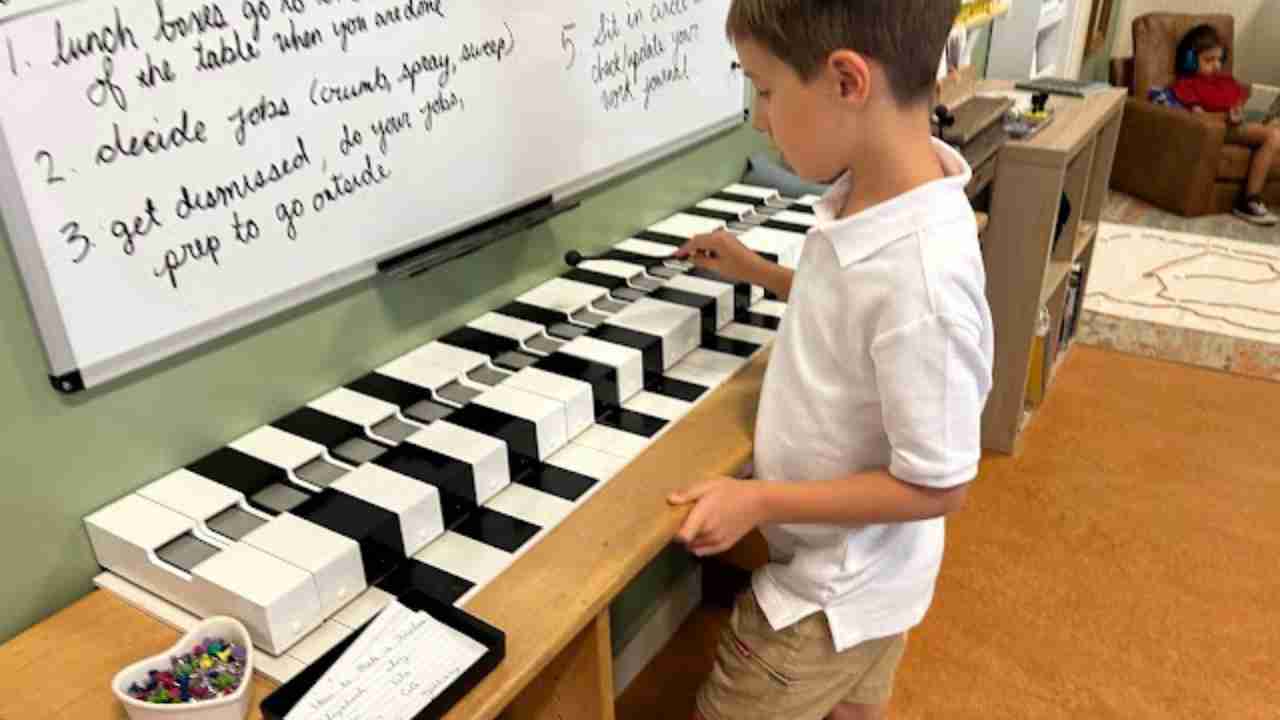 Music includes daily singing, the Bells, the Line, Sound Cylinders, simple instruments, and listening to music from around the world. Appreciation for beauty becomes more intentional, whether through observing a leaf on the playground, a ladybug on the deck, a sunflower at the farm, or a strawberry from their garden.