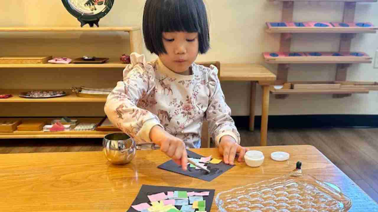 Primary Guides offer foundational lessons in both art and music. Children explore watercolor, sewing, embroidery, metal insets, and materials that introduce dimension and balance. Many lessons from YCC deepen here. For example, gluing evolves from one piece per paper to more complex designs that require planning and sequencing. Flower Arranging and easel painting also increase in complexity.